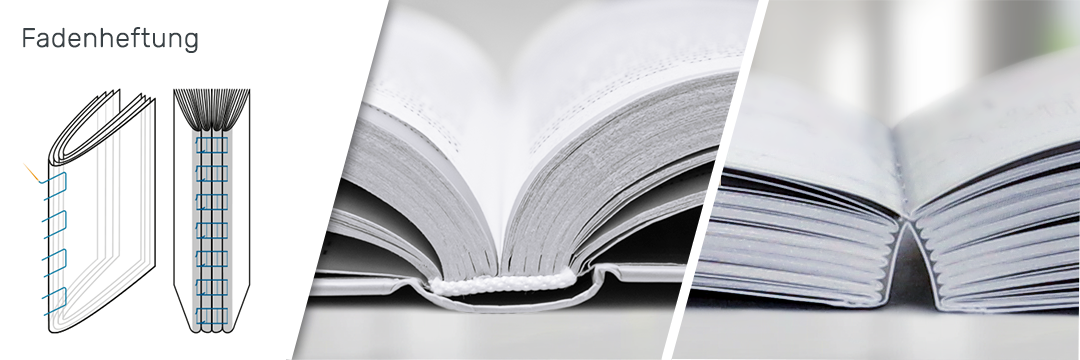 Fadenheftung: Hier werden die Seiten mit einem starken Faden zusammengenäht. Diese Methode bietet höchste Haltbarkeit und ein edles Aussehen.