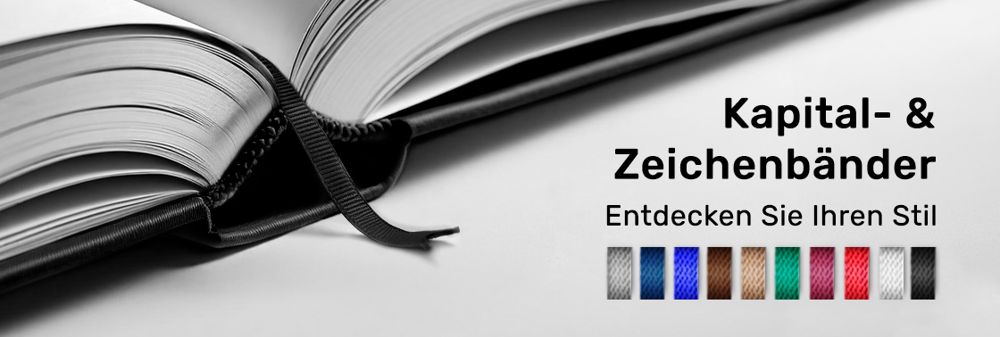 Das Kapitalband ist das dünne Stoffband am oberen und unteren Rand des Buchrückens eines Hardcover-Buches. Mit dem Zeichenband verfügen Sie über ein praktisches und gleichzeitig elegantes Feature, um das schnelle Auffinden von Seiten zu erleichtern. Es sind die kleinen Details, die Ihrem Buch den letzten Schliff geben und das Gesamtbild elegant abrunden. Wie das Kapitalband kann auch das Zeichenband farblich auf den Stil des Buches abgestimmt werden.