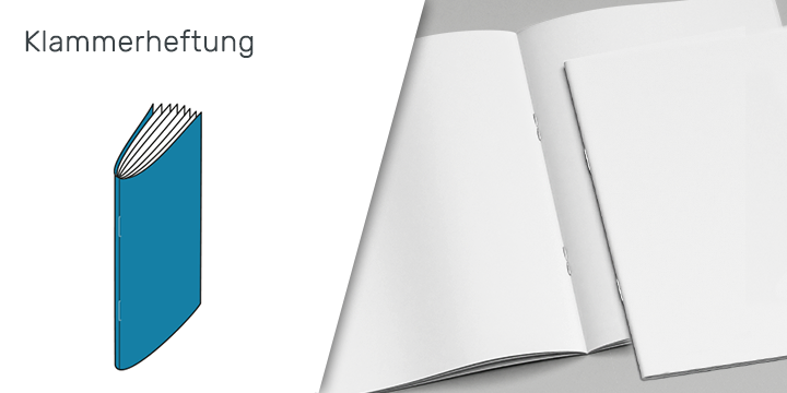 Klammerheftung/Rückstichheftung: Die klassische Wahl für Broschüren mit wenigen Seiten, bei der die Seiten in der Mitte gefaltet und mit Klammern zusammengeheftet werden.
