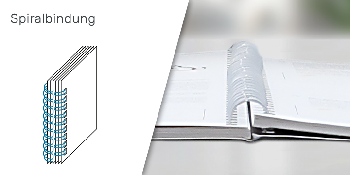 Spiralbindung: Eine Spirale aus Metall oder Kunststoff hält die Seiten zusammen und ermöglicht ein flaches Aufschlagen. Ideal für Dokumente, die leicht umgeblättert werden müssen.
