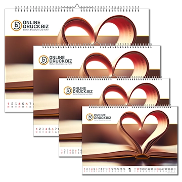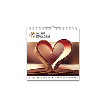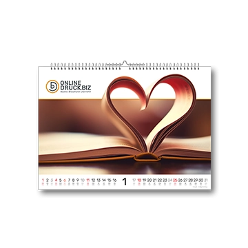 Die Spiralbindung (Wire-O-Bindung) hält alles sicher zusammen und das in Ihrer Wunschfarbe: dezent in Weiß, edel in Schwarz oder stilvoll in Silber. Das Deckblatt darf gerne transparent sein, um einen kleinen Vorgeschmack zu geben, oder blickdicht, um gleich Spannung zu erzeugen. Das stabile Rückblatt aus festem Karton sorgt für Halt, so dass der Kalender sicher an der Wand hängt.