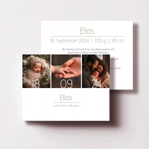 Möchten Sie die Geburt Ihres Kindes bekannt geben? Unsere Geburtskarte "Babywunder" ist ideal dafür. Mit ihrem liebevollen Design und zarten Details bietet diese Karte eine schöne Möglichkeit, Freunde und Familie über die Ankunft Ihres Babys zu informieren und Ihre Freude zu teilen.